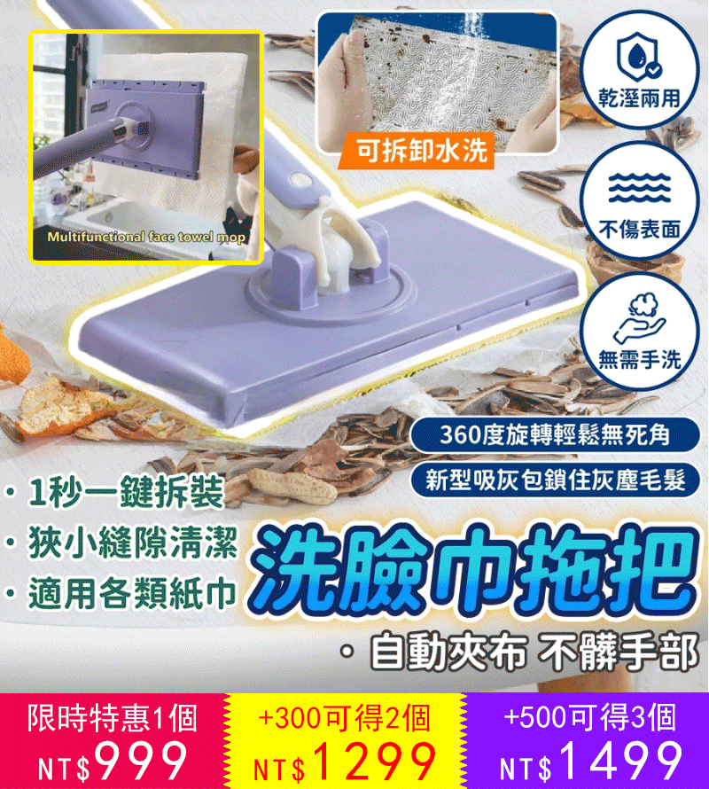 12分鐘前免手洗懒人伸縮拖把,新升級設計,不在擔心拖把不好弄,新升級長度設計,同時不沾手放人工擰拖把,使打掃變得簡單 - 【今日限定 買二送二 4把+ 拖布*4包 】-NT$1299
